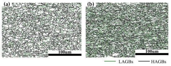 Grain boundary map of the specimens at room temperature: (a) 0%; (b) 15%.