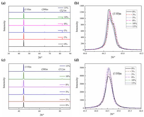 Figure 7 shows the XRD patterns of the specimens with different elongations at room temperature and after quenching. The diffraction pattern of the room-temperature specimens and quenched specimens shows three obvious α-phase diffraction peaks (Figure 7a,c). For the room-temperature specimens, the intensity of the three peaks slightly decreases and broadening occurs with the increase in elongations, especially in the (110)α main diffraction peak. This is caused by strain and lattice distortion during pre-tensile deformation at room temperature. For the quenched specimens, the intensity of the three peaks slightly increases with the increase in elongations, especially in the (110)α main diffraction peak. This is due to the change in the solid solution degree of carbon in the α-phase, and the lattice constants are different, which indicates that the martensite phase distribution is more uniform [23].