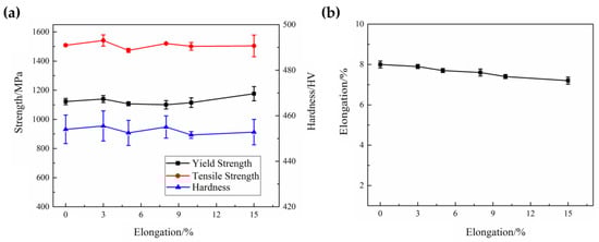 Mechanical properties of the quenched specimens with different elongations: (a) strength and hardness (b) elongation.