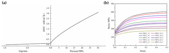 (a) IHTC with the pressure and gap and (b) stress–strain curves of 22MnB5 at different conditions.