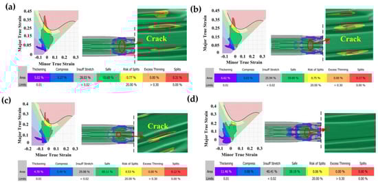 Figure 12 shows the FLD results of the beam part with different pre-forming volumes in the indirect hot stamping. When the pre-forming volume is less than 90%, cracks occur in the sidewall reign of the concave–convex structure in the middle of the parts, and the maximum thickness thinning rate is over 20%. However, with the increase in the pre-forming volumes from 30% to 70%, the maximum thickness thinning rate decreases from 30.1% to 26.5% (Figure 12a–c) and the cracking area decreases. Only when the pre-forming volume is 90% (Figure 12d) is there no crack and the maximum thickness thinning rate is 19.1%, which meets the hot-stamping requirements.
