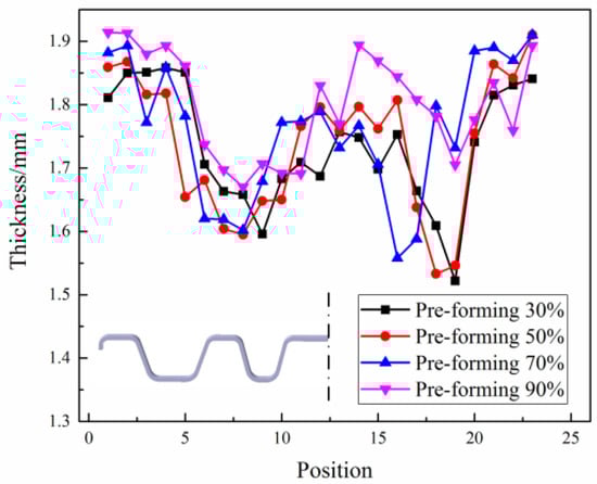 The thickness distribution results in the middle section of the beam part are shown in Figure 13. When the pre-forming volume is from 30% to 70%, the overall thickness values of the parts are low and have an excessive thinning area. In comparison, when the pre-forming is 90%, the thickness distribution of the part is more uniform, and there is no excessive thinning area, which implies better formability. Indirect hot-stamping technology is more advantageous in manufacturing complex parts such as the beam part because most plastic deformation of the part is completed in the pre-forming stage. With the increase in the pre-forming volumes, the size and shape of the pre-formed blank gradually become close to the final part’s size, then the deformation during the subsequent hot-forming stage is small, the role of the subsequent hot forming is more about shaping and forming local features of the pre-formed blank. Thus, the thickness distribution is more uniform and can avoid excessive thinning caused by the large deformation at high temperatures. Therefore, with the increase in the pre-forming volumes, the part will achieve better formability.
