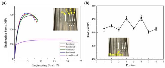 Mechanical properties of the 90% pre-forming test part: (a) engineering stress–strain curve; (b) hardness distribution.