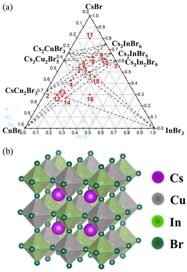 In the ternary diagram, the “double perovskite” phase belongs to three double sections, including CuBr–Cs2InBr5, InBr3–Cs2CuBr3, and CsCu2Br3-Cs3In2Br9, respectively.