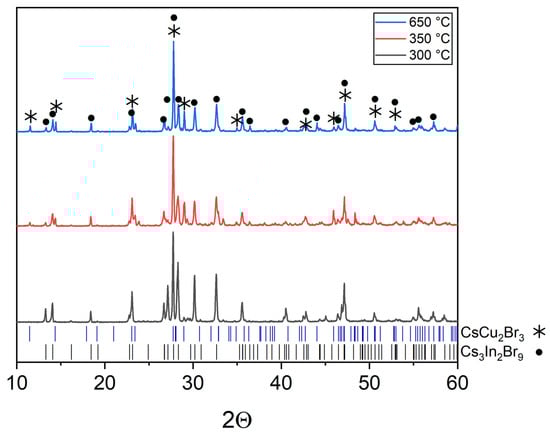 According to the phase, XRD analysis performed (Figure 2), the Cs2CuInBr6 phase is not formed in the whole temperature range of 300–650 °C, but the sample ‘1’ includes two phases of binary bromides Cs3In2Br9 and CsCu2Br3. No single bromides have been found as a result of the full transformation to binary bromides Cs3In2Br9 and CsCu2Br3. It is also noticeable that the XRD patterns for the samples annealed at 350 °C and 650 °C are much more similar than for the samples annealed at 300 °C and 350 °C, respectively. Most likely, the eutectic temperature for the composition ‘1’ is in the temperature range of 300–350 °C.