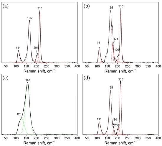 The Raman spectra of the samples synthesized at 300 °C and 650 °C are given in Figure 5a,b. The spectra contain well-defined characteristic modes related mostly to the Cs3In2Br9 phase. The most intensive modes are: ν (A1g)—165 cm−1, ν(Eg)—216 cm−1 and 111 cm−1 [40]. Most likely, this is the result of higher crystallinity (larger size of crystallites) for the Cs3In2Br9 phase.