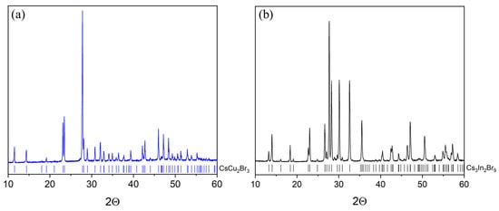 XRD data of (a) a sample ‘2’ (CsCu2Br3 phase), and (b) sample ‘3’ (Cs3In2Br9 phase).