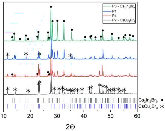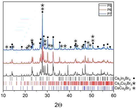 Points ‘8’, ‘9’, and ‘10’ are on the inclusion Cs2CuBr3-Cs3In2Br9 section (Figure 1a). Points ‘9’ and ‘10’ contain phases Cs3In2Br9 (Springer materials ID: sd_1712349) and Cs3Cu2Br5 (PDF (01-072-9849)) according to the XRD results (Figure 10). Apparently, during crystallization from the melt on the Cs2CuBr3-Cs3In2Br9 section, the formation of the Cs3Cu2Br5 phase is preferable, while solid-phase synthesis leads to Cs2CuBr3.