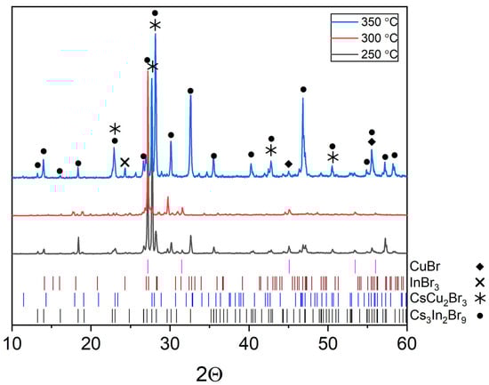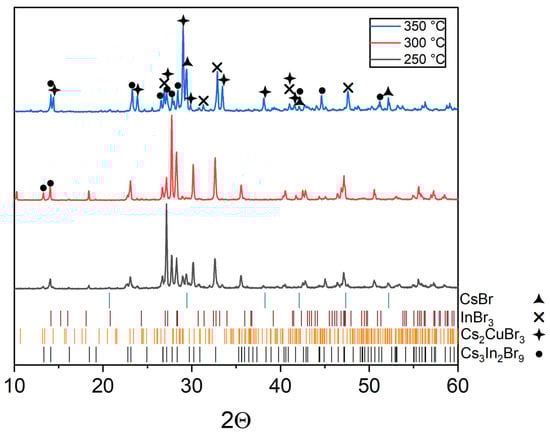 According to the experimental data, it is difficult to draw an unambiguous conclusion about the effect of temperature increase on the shift of equilibrium to the right or to the left since the number of reflections increases with a growth in the annealing temperature. The relative intensity of reflections changes, and reflections overlap each other. At the same time, based on single reflections, it can be seen that the relative intensity of the CuBr phase reflections decreases while the intensity of the main reflections of the CsCu2Br3, Cs3In2Br9, and InBr3 phases increases. Thus, it is most likely that equilibrium (3) shifts to the right with an increase in the annealing temperature. In this case, the increase in the intensity of reflections of the cesium bromoindate(III) phase can be explained by the formation of larger crystallites of this phase with increasing temperature.