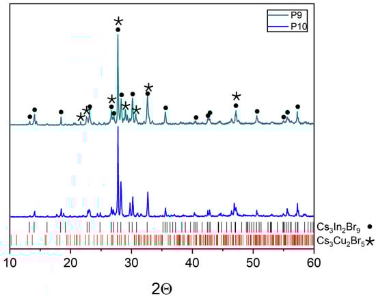 XRD data for point ‘9’ (intersection of incisions Cs2CuBr3-Cs3In2Br9 and CsCu2Br3-Cs2InBr5) and point ‘10’ (intersection of incisions Cs2CuBr3-Cs3In2Br9 and CuBr-Cs2InBr5).