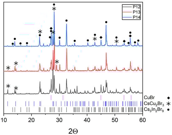 XRD data for point ‘12’ (intersection of incisions CsCu2Br3-InBr3 and CuBr-Cs3InBr6), point ‘13’ (intersection of incisions CsCu2Br3-InBr3 and CuBr-Cs2InBr5) and point ‘14’ (intersection of incisions CsCu2Br3-InBr3 and CuBr-Cs3In2Br9).
