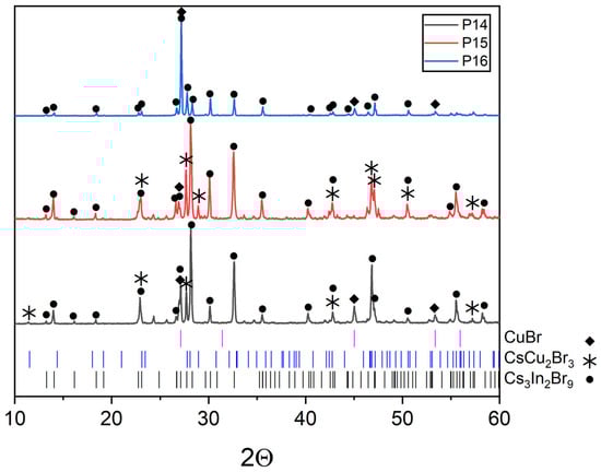 Also, the phase composition of point ‘16’ consists of the CuBr and Cs3Cu2Br9 phases due to the XRD data (Figure 14). This fact confirms the stability of the CuBr-Cs3In2Br9 section, point ‘15’ (intersection of incisions CuBr-Cs3In2Br9 and Cs2CuBr3-InBr3), point ‘16’.