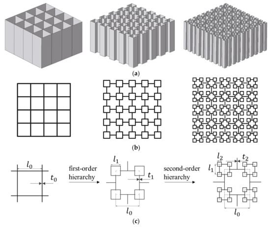 Many natural materials have good energy absorption properties due to their structural characteristics [,,]. One characteristic is the hierarchical structure widely found in organic and biological systems, such as bones, wood, gecko foot pads, and sponges [,,,]. These biomaterials exhibit excellent properties due to the cross-scale modulation of the hierarchical structure from the microscopic to the macroscopic [,,,,,,]. In recent years, many man-made materials with remarkable hierarchical structures have been developed, such as sandwich cores, polymers, and composites, which have achieved superior mechanical properties [,,,,]. Simultaneously, existing research has demonstrated that the responses and interactions of different length scales and hierarchies determine the overall behaviors of hierarchical structures [,,,,,]; this means different orders of the hierarchical structure have different properties. Therefore, by tuning the structural hierarchy and the geometric properties of the substructures, it is possible to improve the lightness and performance of materials. Liu et al. [] investigated three hierarchical cubic lattice structures and six kinds of hybrid hierarchical lattice structures to study the synergistic hierarchical arrangement effect.
