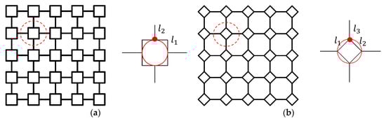 To ensure iteration of the VHS, some construction rules must be followed, and some geometrical constraints on the hierarchically introduced edges must be imposed. Figure 2 illustrates two different geometric constructions of first-order VHS. These two modes are the only geometric constructions that VHS can adopt. In each of these two constructions, the four connection points of the VHS substructure fall exactly on the red circle, found in Figure 2. Inspired by the orthogonal polygon’s inner and outer tangent circles, the construction path of Figure 2a,b are named the inner-tangent circle pattern and outer-tangent circle pattern, respectively. The inner-tangent circle pattern is the only way to achieve infinite iterations of the VHS.