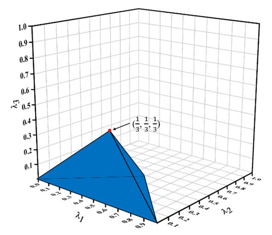 According to Equation (4), a range of values for the structural ratio of the third-order VHS can be obtained, which is exactly a tetrahedral space, as illustrated in Figure 4. The projection of this space in the -plane is the range of values for the structural ratio of the third-order VHS.