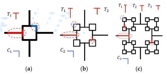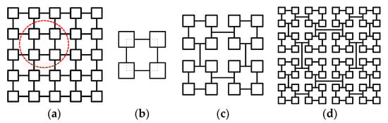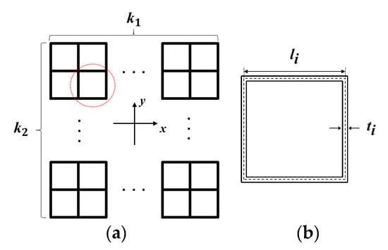 where , and are the wall thickness, the cell’s side length, and the cell’s number in the x and y direction of the initial material, respectively. In Figure 6, we find that the i-th sub-structure is formed by replacing the 16 vertices of the i − 1-th sub-structure with smaller squares, where the edge length is and the thickness of the new VHS is reduced to . In this process, the total cross-section length of the new sub-structure increases by 16. However, in terms of the i − 1-th sub-structure, it loses 4.