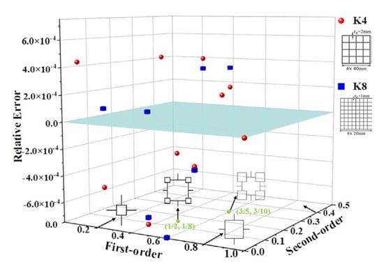 The finite element models were established through ANSYS, based on the initial structure of K4 and K8, and the density of the material is taken as 2.8 g/cm3. The model masses of different are calculated separately and compared with the results calculated by theoretical Equation (14), provided in Figure 7. The theoretical results are extremely precise, considering that the relative error between the two results is within 7.5 × 10−4. Table 3 shows the thickness of the VHS with different structural ratios.