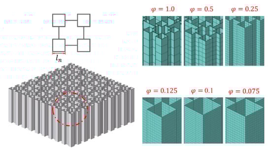 where and is the mesh size and the min sub-structure of the VHS, respectively, as illustrated in Figure 9. The second-order VHS of = 0.5, = 0.25 was adopted for the test. The material thickness of the verification structure is provided in Table 2 as 0.552 mm.