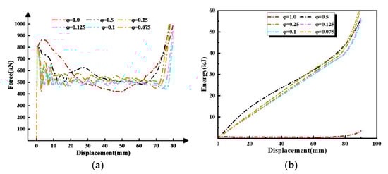 In general, including total energy absorption (TEA), specific energy absorption (SEA), and the mean crushing force (), these typical criteria are widely used to evaluate the crashworthiness of materials, as illustrated in Table 4 [,,]. In this paper, these criteria were adopted to evaluate the crashworthiness of the VHS.