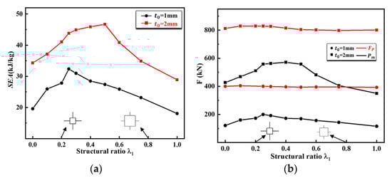 Comparison of crashworthiness of the first-order VHS under different thicknesses: (a) SEA of first-order VHS with and 2 mm; (b) & of first-order VHS with and 2 mm.