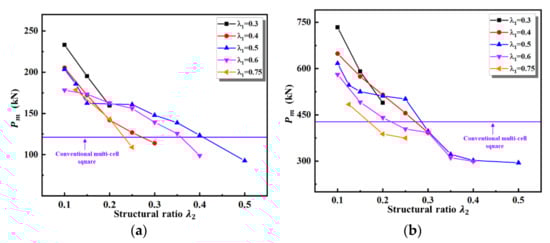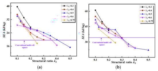 The second-order VHS has a 102.4% and 77.9% improvement in SEA compared to conventional multi-cells, with initial material thicknesses of 1 mm and 2 mm, respectively. At the same time, there is also a significant improvement in the mean crushing force. As the values of increases, the SEA and of the second-order VHS are much smaller than the conventional multi-cell square. This is mainly due to the negative effect of the dramatically reduced material thickness outweighing the structural effect of the vertex base.