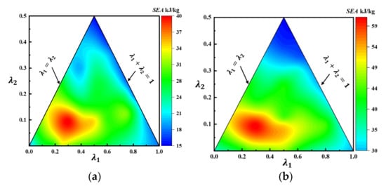 To analyze the influence of the structural ratio () in more detail, Figure 14 plots the SEA contours for first-order and second-order VHS with different initial material thickness and possible values of and . From Figure 14, it is clear that the closer the sum of the values of and of the second-order VHS is to 1, the lower its SEA. When and are both equal to 0.5, the SEA of the second-order VHS reaches a minimum. As can be observed in Table 3, the lowest material thicknesses of the second-order VHS are found at values of 0.5 for both and .; this, again, indicates that material thickness is critical to its SEA. To achieve optimum crashworthiness, the above analysis demonstrates that the design region for the second-order VHS should be within the range of , and .