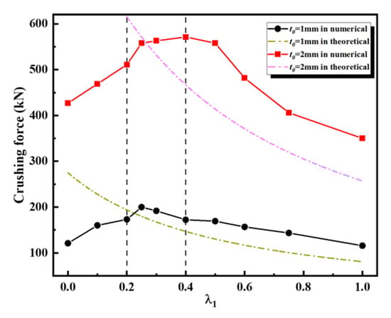 Comparisons of crushing force of first-order VHS with different thicknesses between theoretical and numerical results.