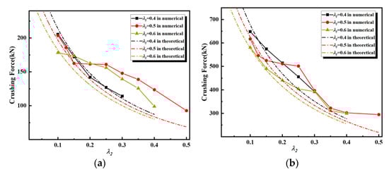 Comparisons of crushing force of second-order VHS with and , respectively, between theoretical and numerical results. (a) ; (b) .