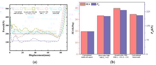 Comparison of crashworthiness of VHS and conventional honeycomb under the same weight: (a) crushing force versus the conventional honeycomb and VHSs, and (b) SEA & Pm of the conventional honeycomb and VHSs.