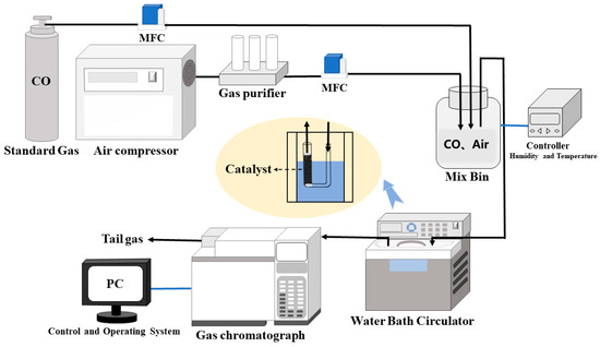 Catalyst stability was also evaluated using a small fixed-bed continuous-flow reaction device, as shown in Figure 2. Here, the CO standard gas was diluted with a specific flow of compressed air to control the rate of CO generation. A U-shaped hard quartz tube with an inner diameter of 1 cm was used as the reaction tube. The height of the catalyst bed in the reaction tube was 8 cm, the bed density was 0.64 g/cm3, the volume space velocity was 13,000 h−1, the reaction temperature was 25 °C, and the concentration was 20,000 ppm. The concentrations of CO and CO2 in the tail gas were determined using gas chromatography (HP6890).