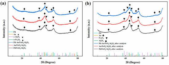 XRD patterns of Pd/FeOx/Al2O3, Au/FeOx/Al2O3, and Pd-Au/FeOx/Al2O3 catalysts. Before catalysis (a) and after catalysis (b).