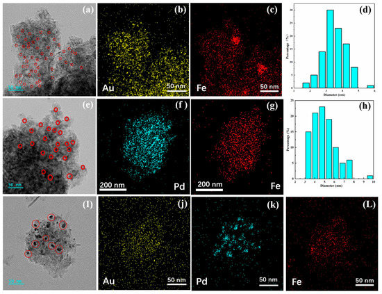 HRTEM diagram of the Au/FeOx/Al2O3 catalyst (a), with characterisation of its Au and Fe elemental distribution (b,c) and Au particle size distribution (d). HRTEM diagram of the Pd/FeOx/Al2O3 catalyst (e), with characterisation of its Pd and Fe elemental distribution (f,g) and Pd particle size distribution (h). HRTEM diagram of the Pd-Au/FeOx/Al2O3 catalyst (I), with characterisation of Au, Pd, and Fe elemental distribution (j–L).