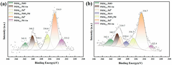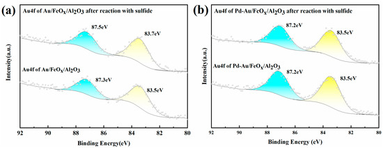 XPS spectra were used to analyse the Au4f and Pd3d valence states of Au/FeOx/Al2O3 and Pd-Au/FeOx/Al2O3 after treatment with SO2 and H2S (Figure 6 and Figure 7). Figure 6 shows the Au4f binding spectra of both catalysts. The peaks of Au/FeOx/Al2O3 at 87.3 eV and 83.5 eV were assigned to Au4f 5/2 and Au4f 7/2, respectively, both of which corresponded to Au0 (Figure 6a) [42,43]. After vulcanisation, the peaks corresponding to Au4f 5/2 and Au4f 7/2 increased in energy, appearing at 87.5 eV and 83.7 eV, respectively. This may be caused by the reaction of SO2 and H2S with gold nanoparticles to form Auδ+. For Pd-Au/FeOx/Al2O3, the Au4f 5/2 and Au4f 7/2 peaks remained unchanged with SO2 and H2S addition (Figure 6b), indicating that the addition of Pd weakened the effect of SO2 and H2S on the Au nanoparticles.