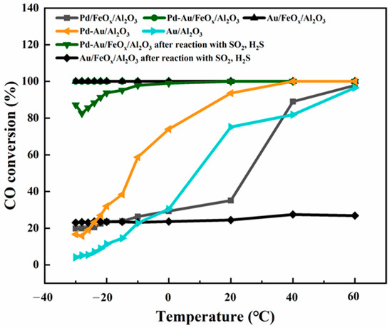 Figure 8 shows the CO conversion for the catalytic oxidation of CO at different temperatures using Au/FeOx/Al2O3 and Pd-Au/FeOx/Al2O3 as catalysts before and after SO2 and H2S pretreatment. Compared with Pd/FeOx/Al2O3 catalysts, the activities of Pd-Au/FeOx/Al2O3 and Au/FeOx/Al2O3 catalysts were significantly improved. Compared with Au/Al2O3 and Pd-Au/Al2O3 catalysts, after the addition of FeOx, the activities of Pd-Au/FeOx/Al2O3 and Au/FeOx/Al2O3 catalysts were significantly improved. The Pd-Au/FeOx/Al2O3 and Au/FeOx/Al2O3 catalysts without SO2 and H2S pretreatment had excellent CO conversion rates, achieving complete conversion at a CO concentration of 2500 ppm in the −30–60 °C temperature range. After SO2 and H2S pretreatment, the Pd-Au/FeOx/Al2O3 catalyst conversion rate for a CO concentration of 2500 ppm was 87.2% at −30 °C, and the conversion rate was 100% for temperatures above 25 °C. However, the conversion rate of Au/FeOx/Al2O3 after SO2 and H2S pretreatment was only 23–26% at all tested temperatures, indicating that the Pd-Au/FeOx/Al2O3 catalyst was affected less by SO2 and H2S, matching the observed low SO2 and H2S adsorption measured by XEDS.