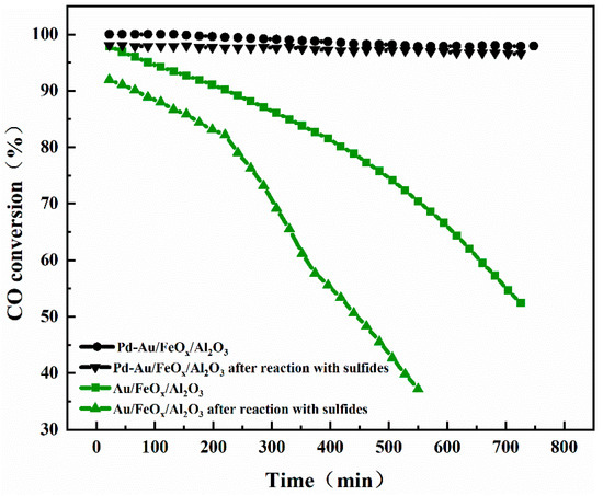 Figure 9 shows the catalytic oxidation stability test curves of the Au/FeOx/Al2O3 and Pd-Au/FeOx/Al2O3 catalysts for CO at 25 °C before and after SO2 and H2S treatment. The conversion rate of the Au/FeOx/Al2O3 catalyst decreased from 97.9% to 52.4% after 726 min, which was slower than that of the Au/FeOx/Al2O3 catalyst pretreated with SO2 and H2S (91.9% to 37% after 550 min). The conversion rate of Pd-Au/FeOx/Al2O3 was 100% in the first 132 min, the TON of it was 205, and it declined slowly to 97.9% after 748 min. Similarly, the conversion rate of SO2- and H2S-pretreated catalyst decreased from 98.1% to 96.5% after 726 min. Thus, Pd-Au/FeOx/Al2O3 maintained strong stability after SO2 and H2S treatment, with negligible conversion reduction (approximately 2%) after 726 min. It is deduced that this is due to the adsorption of SO2 and H2S on the catalyst surface, which inhibits the adsorption and reaction of CO.