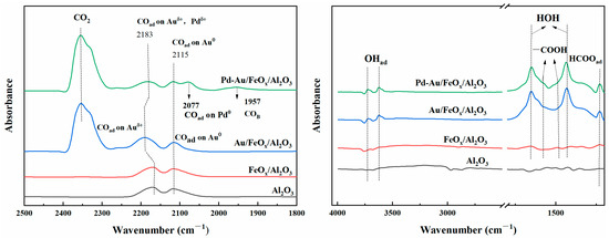Figure 10 shows the in situ FTIR spectra of Al2O3, FeOx/Al2O3, Au/FeOx/Al2O3, and Pd-Au/FeOx/Al2O3 with a 2% CO mass fraction. Both the Pd-Au/FeOx/Al2O3 and Au/FeOx/Al2O3 catalysts exhibited peaks corresponding to -OH (3600–3700 cm−1), -COOH (1300–1700 cm−1), CO (~1900 cm−1, 2000–2200 cm−1), and CO2 (2300–2400 cm−1) vibrations [51,52]. -OH represents water adsorbed on the catalyst surface and reacting with the catalyst surface active oxygen species. COad reacted with -OHad to produce -COOH, which adsorbed on the catalyst surface [53]. The peak intensities of -OH and -COOH on Pd-Au/FeOx/Al2O3 were similar to those of Au/FeOx/Al2O3. However, for the Pd-Au/FeOx/Al2O3 catalyst, CO was adsorbed on Pd0, Pdδ+, Au0, and Auδ+. The peak at 2077 cm−1 corresponded to CO adsorption on Pd0 [52]. The peak of adsorbed CO on the Pd-Au/FeOx/Al2O3 catalyst (2183 cm−1) had a higher frequency than that of Auδ+ on the Au/FeOx/Al2O3 catalyst (2190 cm−1), possibly because of overlapping peaks [51,52,54,55,56]. Bridge adsorption (COB) of CO occurs at 1957 cm−1; that is, CO is adsorbed on the metal centre of Au and Pd [53,57]. Based on the literature and in situ FTIR measurements, we concluded the reaction path of CO adsorbed at the active centre of the catalyst (Au0, Auδ+, Pd0, and Pdδ+), reacting with adsorbed water to produce CO2 and -COOH, while -COOH partially accumulated on the catalyst’s surface and partially reacted with oxygen on the catalyst’s surface to produce CO2 and release gradually [53].