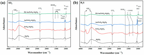 In situ FTIR spectra of the support, Au/FeOx/Al2O3, and Pd-Au/FeOx/Al2O3 treated with SO2 (a) and H2S (b) at 25 °C.
