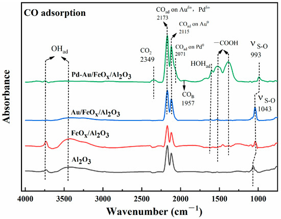 After SO2 and H2S pretreatment, air was used as the equilibration gas. A mixture with 20,000 ppm of CO was injected, and the material was characterised by in situ FTIR (Figure 12). The vibration peak of CO increased after CO was injected into the support, Au/FeOx/Al2O3, and Pd-Au/FeOx/Al2O3. In contrast, the vibration peak of CO2 (2349 cm−1) only increased for the Pd-Au/FeOx/Al2O3 catalyst. On the Pd-Au/FeOx/Al2O3 catalyst, bridging CO was adsorbed on the active sites of Au and Pd at 1956 cm−1 [53], and the vibration peak at 2071 cm−1 corresponded to CO adsorbed on Pd0. The vibration peak at 2115 cm−1 corresponded to CO adsorbed on Au0. The vibration peak at 2173 cm−1 corresponded to Auδ+ and Pdδ+ [52,57]. Thus, a large amount of CO was adsorbed on the bimetallic active sites of the Pd-Au/FeOx/Al2O3 catalyst, reacting to produce CO2. In contrast, no CO2 production was observed on the Au/FeOx/Al2O3 catalyst, possibly because the sulphate species adsorbed and accumulated on the Au/FeOx/Al2O3 catalyst inhibited the reaction of CO with the active centre of the catalyst. Additionally, the peak corresponding to the vibration of -COOH adsorbed on Pd-Au/FeOx/Al2O3 was derived from the reaction of CO adsorbed on the catalyst surface with reactive oxygen species and absorbed water [53].
