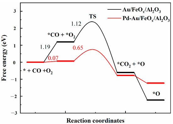 Maumau T.R. et al. [61] compared the electro-oxidation activity of Pd/C, Au/C, Pd (Au/C), and Pd-Au/C catalysts to alcohols and found that Pd-Au/C catalysts were more stable and more toxic tolerant. Comparing the reaction kinetics of Pd-Au/SiO2 and Pd/SiO2 catalysts, Han Y.F. et al. [62] showed that the decrease in reactant adsorption on the catalyst and the enhancement of surface adsorbed oxygen/adsorbed oxygen mobility were the main reasons for the enhancement of Pd-Au/SiO2 catalyst activity. Gao feng et al. [63] compared Pd-Au particles supported on different carriers and applied reaction kinetics analysis to find that the Pd-Au-supported catalyst was more likely to oxidize and lose activity than the Pd-Au-supported catalyst, and Pd-Au was more likely to desorb CO, which was also the main reason for the enhanced activity of the Pd-Au-supported catalyst. As shown in Figure 13, the reaction free energy curve calculated using DFT shows that *CO and *O2 adsorption on Au/FeOx/Al2O3 was very weak, with an energy change of 1.19 eV. Pd-Au/FeOx/Al2O3 had a lower free energy of 0.07 eV. Regarding the transition state, the energy barriers corresponding to *CO to *CO2 oxidation by Au/FeOx/Al2O3 and Pd-Au/FeOx/Al2O3 catalysts were 1.12 eV and 0.65 eV, respectively, indicating that Pd-Au/FeOx/Al2O3 is thermodynamically more likely to oxidise CO.