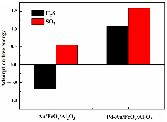 Finally, the antivulcanisation of Au/FeOx/Al2O3 and Pd-Au/FeOx/Al2O3 was investigated. The adsorption energy diagrams of H2S and SO2 were obtained from the difference in SO2 and H2S adsorption energies (Figure 14). Higher adsorption energy corresponded to more difficult SO2 and H2S adsorption. The adsorption energy of Pd-Au/FeOx/Al2O3 was positive for both H2S and SO2, whereas that of Au/FeOx/Al2O3 for H2S was negative. The adsorption energy of Au/FeOx/Al2O3 for SO2 was also significantly lower than that of Pd-Au/FeOx/Al2O3. Thus, Pd-Au/FeOx/Al2O3 has a weak adsorption capacity for SO2 and H2S and a more substantial anti-SO2 and anti-H2S effect, indicative of its long-term stability in a sulphur-containing environment.