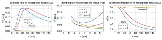 Imaginary and real parts of the solution of Equation (9), i.e., the damping rate and the self-frequency of the dipole mode of surface plasmon resonance in a metallic nanoparticle (Au), given by Equation (10), versus the radius of the nanosphere a ( and in units of ). The resonances in a vacuum () and in dielectric surroundings with are compared. The decrease in with a acc. to Equation (2) is also plotted in the left panel (zoom of the cross-over region from the left is shown in the central panel). In the right panel, the frequency for the harmonic damped oscillator, , is also plotted (upper curve) for comparison with the exact anharmonic solution.