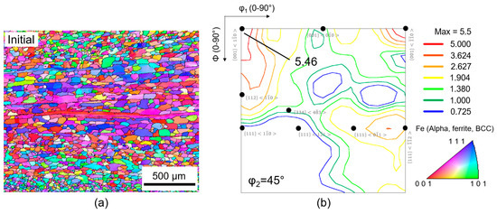 (a) Inverse pole figure and (b) reduced ODF map of the initial sample of ferritic STS in the central region.