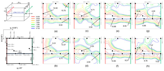 Reduced ODF sections () of the sample after the first rolling for (a) route A and (b) route B, IA for (c) route A and (d) route B, second rolling for (e) route A and (f) route B, and FA for (g) route A and (h) route B.