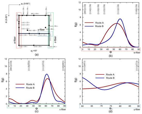ODF intensity distributions carried out on reduced section () with (a) details of analysis range on α-fiber (red outline), ε-fiber (green outline), and γ-fiber (blue outline). ODF intensity distribution for analysis range on (b) α-fiber, (c) ε-fiber, and (d) γ-fiber in route A and route B.