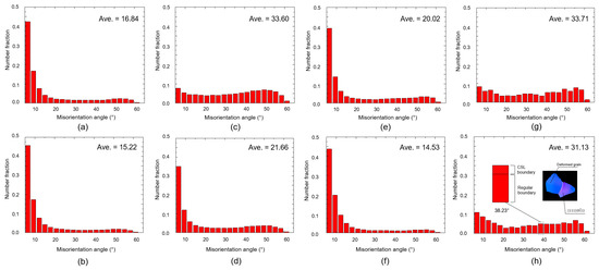 After the first rolling (Figure 6a,b), the average misorientations between route A and B were slightly different and characterized by the existence of a high fraction of boundaries with a low misorientation angle (~6°) or low angle grain boundaries (LAGBs). The average misorientation for route A was larger than that for route B, which is most likely due to the higher thickness reduction during the first rolling in route A than that in route B. After the first annealing (Figure 6c,d), the difference became more obvious, where the average misorientation of route A (33.60) was higher than that of route B (21.66). Here, a high fraction of LAGBs transformed into high angle grain boundaries (HAGBs) with misorientations higher than 6°. For route B, only a small amount of LAGBs were transformed, which is most probably due to the lack of driving force originating from the low thickness reduction during the first rolling [22]. After the second rolling (Figure 6e,f), the fraction of LAGBs increased again in both cases. The average misorientation in route B remained lower than that of route A. This might be attributed to the fraction of LAGBs formed previously during the first rolling. After final annealing (Figure 6g,h), the average misorientations between A and B were very close to each other. Several interesting points could be drawn from Figure 6g,h. Firstly, although the average grain size in route B was finer than that in route A (Figure 3c,d), the average misorientation in route B was surprisingly lower than that in route A. Secondly, some fractions of the boundary in route B (in this case, the boundary with a misorientation of ~38.23°, as shown in Figure 6h) were characterized by the coincidence site lattice (CSL) boundary. The first point might be associated with a considerable amount of boundary that remains as an LAGB in route B, and the others might be due to the formation of CSL boundaries of Σ7 with a misorientation of ~38.23°, which is close to the average value of misorientation. Interestingly, such boundaries border the deformed grain, with the grain (or nuclei) exhibiting the orientation.