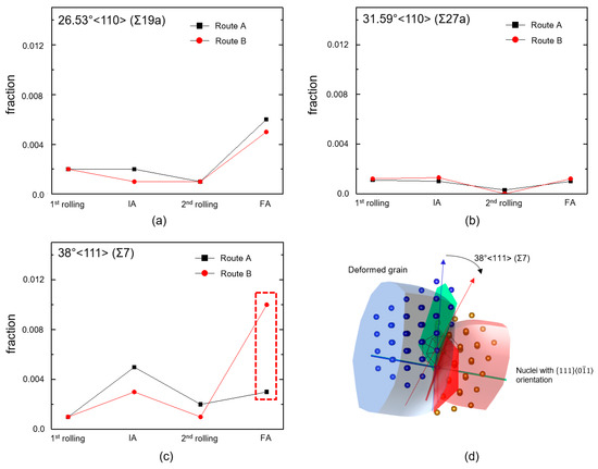 The particular nuclei exhibiting CSL boundaries will not inherit their orientation from the deformed neighboring grains (termed as orientation selectivity) [23], which would be beneficial to add more variety in terms of orientation other than the orientation of the deformed grains. In addition, CSL boundaries with rotation axes parallel to especially the axis and axis were favorable for the growth of nuclei [24,25]. Moreover, in the case of Σ7, the growth was expected to be rapid and contributed significantly to final recrystallization textures via the selective growth mechanism [26]. Here, in addition to the observed CSL boundaries of Σ7 (38°⟨111⟩), two other CSL boundaries, namely Σ19a (26.53°⟨110⟩) and Σ27a (31.59°⟨110⟩), which are commonly found during annealing treatment, will be investigated throughout the thermomechanical processes [26]. As shown in Figure 7a,b, no significant difference was found in terms of the fraction of the Σ19a and Σ27a boundaries between route A and route B, respectively. On the other hand, Figure 7c shows that the fraction of Σ7 boundaries in route B was much higher as compared to route A during the final annealing. Manual indexing of the IPF maps revealed that most of the Σ7 boundaries bordered the deformed grain and the nuclei with orientation, as shown schematically in Figure 7d. This explained the higher densities of orientation in route B as compared to route A. It was reported previously that Σ7 boundaries might have occurred during recrystallization in the case of microstructure with concentrated deformation texture [26], which was in agreement with our result in Figure 5b,c.