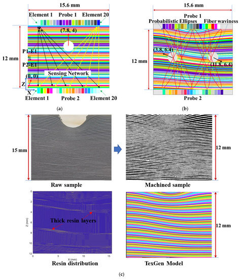To sum up, the abovementioned UT technologies are mainly aimed at single-type defect inspection and cannot achieve the characterization and differentiation of mixed-type defects in thick CFRP. Fiber waviness (especially out-of-plane fiber waviness) and thick resin layers may coexist in thick composites [6]. Both defects can distort ultrasound propagation and result in variations in wave reflection and transmission. In addition, volumetric defects may interfere with instantaneous amplitude and phase features of ultrasound and cause fake images of fiber orientations constructed by instantaneous ultrasound information [3]. To provide accurate defect information for the processing parameter optimization of thick CFRP, identification between volumetric defects and fiber waviness in thick wavy composites using a multiple-frequency method [32] and ultrasound non-reciprocity [25,33] (manifested as time-of-flight difference when wave propagation direction is reversed) were proposed in our previous work. In this study, a novel imaging method of fiber waviness using probability-based ultrasound non-reciprocity with unknown material properties is proposed for defect characterization in thick composites.