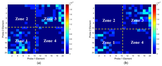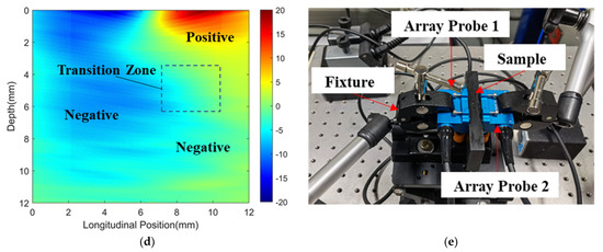 represents the of the transmitted ultrasound excited at the bottom element and received by the top element , and is the when the wave propagation direction is reversed. Note that in this study was calculated using the arrival time of the signal’s highest peak of the first wave packet in the time domain, so ultrasound propagating along oblique paths in the non-wavy composites did not show measurable non-reciprocity. As shown in Figure 1a,b, array elements (pitch distance is 0.6 mm) on the two probes form a sensing network and the whole sample area can be covered by using FMC technology. A revised probability-based diagnostic algorithm [34] using ultrasound non-reciprocity along different wave paths was developed to image fiber waviness as below: