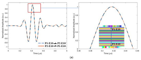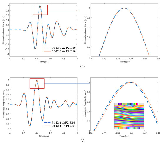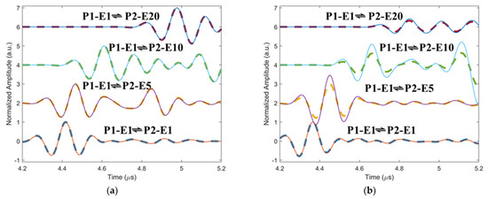 To validate the effectiveness of the senor network built by the two phased array probes for the inspection of fiber waviness, simulated ultrasound signals propagating along different directions in the non-wavy and wavy composites without voids are shown in Figure 4a and Figure 4b, respectively. The legends P1-E1 and P2-E1 mean element 1 in the phased array probes 1 and 2, as shown in Figure 1a,b. P1-E1 ⇌ P2-E1 means signals transmitting between the element 1 of the two probes. The solid lines represent signals propagating downwards, and the dashed lines are for signals propagating upwards. The waveforms of the two signals propagating in different directions along the same wave path within the non-wavy composites remain the same regardless of the propagation angles relative to the fibers. Therefore, inclined interaction angles between ultrasound and straight fibers are not the cause of ultrasound non-reciprocity. However, for ultrasound propagating in the wavy composites, a noticeable difference can be observed in the waveforms when the wave propagation direction is reversed. Therefore, the fiber angle gradient induced by fiber waviness is responsible for the generation of ultrasound non-reciprocity, as shown in Figure 1d.