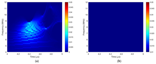 To gain insight into the generation mechanisms of ultrasound non-reciprocity in composites, the of ultrasound propagating in the intact, porous and wavy composites was firstly investigated. Three pairs of transmitted signals along reversed directions captured from the three types of samples are shown in Figure 2. The legends P1-E10 and P2-E10 mean element 10 in the phased array probes 1 and 2. P1-E10 ⇀ P2-E10 means ultrasound excited on P1-E10 and received on P2-E10. Other legends in Figure 2 were named using the same principle. From comparison, fiber waviness generates noticeable between the two transmitted signals, as shown in Figure 2c, while no measurable is present in the other two cases, as shown in Figure 2a,b. To further explore the cause of ultrasound non-reciprocity in the wavy composites, the time–frequency spectra of the transmitted ultrasound in the three types of composites were comparatively calculated using squeezed wavelet transform [35], and they are displayed in Figure 3a,c,e (color bar indicates signal magnitude). Taking the time–frequency spectra of the transmitted signal in the intact sample as a reference (Figure 3a), fiber waviness (Figure 3c) introduces larger changes in the time–frequency features of the transmitted signals compared to voids (Figure 3b). Compared to Figure 3a, high-frequency components in the 9–11 MHz range are produced, while low-frequency components in the 6–9 MHz range reduce for the first-arrival wave (4.1–4.5 ), as shown in Figure 3c. Such changes in the frequency distributions can be attributed to frequency-dependent transmission coefficients of the ultrasound at different frequencies in the anisotropic layered structure. Variations in the fiber orientations and the presence of thick resin layers change the local material properties (e.g., density, stiffness and layer thickness); consequently, the transmission coefficients of the ultrasound at different frequencies in the wavy composites differ from those of non-wavy composites. No observable non-reciprocity in the transmitted ultrasound was present for either the intact composites (Figure 3b) or the porous composites (Figure 3d). While fiber waviness induces measurable non-reciprocity in the time–frequency spectrum of the transmitted signal (Figure 3f), fiber waviness induces unsymmetrical changes in the material properties; therefore, the frequency-dependent transmission coefficients of ultrasound become different when the propagation direction is reversed. Due to the dispersion behaviors of ultrasound in anisotropic composites, ultrasound non-reciprocity manifesting as a difference in group velocity is generated in the wavy composites.